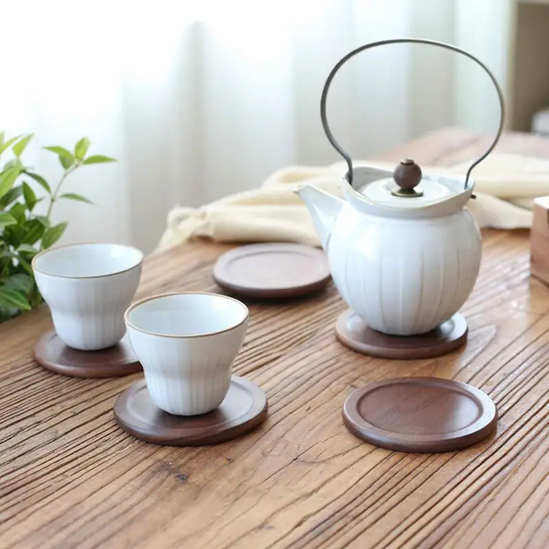 صور من 6 قطعة الجوز طقم قواعد أكواب جولة خشبية القهوة فنجان شاي سادة طاولة طعام بوثولدير الكلاسيكية الجدول حصيرة كوستر المنزل المطبخ المنتجات